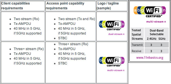 Qui sotto si vedono i bollini che dovrebbero spiegare chiaramente quali tecnologie Wi-Fi sono integrate nei dispositivi in vendita, con doppio o multiplo stream a seconda delle antenne usate. Non speriamo di trovarli sulle sobrie confezioni dei prodotti Apple.