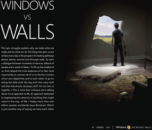 affissione (a New York City in Times Square e all'aeroporto Kennedy), accanto vedete uno dei soggetti scelti. L'azienda di Redmond vuole "abbattarere i muri" per un'esperienza completa di Windows dal laptop al desktop attravero lo smartphone e arrivando nel televisore… una specie di incubo da svegliarsi sudati e tremanti!