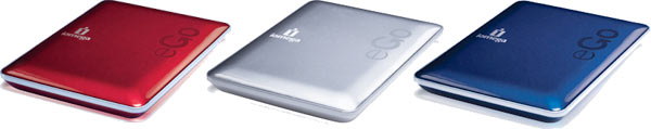 I nuovi eGo sono custoditi in un case d'alluminio colorato in rosso rubino, blu cobalto ed argento, offrono unicamente la connessione USB 2. E' fornito anche un doppio cavo a "Y" per l'alimentazione supplementare, ove servisse.
