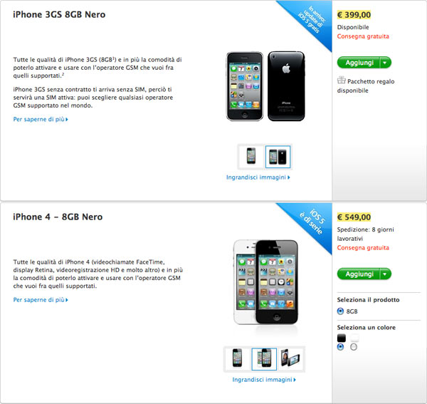 Intanto l’Apple Store accetta già gli ordini per i modelli “vecchi” dello smartphone, ovvero quelli fino ad oggi in commercio nelle varianti da 16 e 32 GB per l’iPhone 4. Solo che ora l’iPhone 4 è venduto solo con 8 GB di memoria, ma non più a 663 e 784 euro, bensì a 549 euro. L’attesa prevista è di 8 giorni lavorativi per riceverlo a casa, anche perché sarà già installato iOS 5 e quindi non potrà arrivare prima del 12 ottobre.