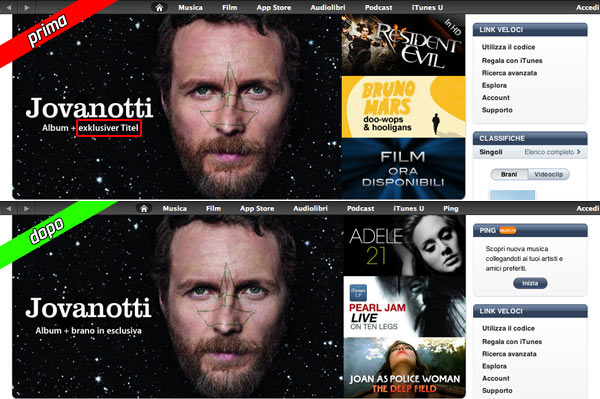 Va notato che fino a mercoledì il grande banner a rotazione sulla pagina principale di iTunes Store Italia del nuovo album di JovanoTTi parlava in tedesco, ma dopo la nostra segnalazione qualcuno ha mollato il Pons per lo Zingarelli e tutto è andato a posto con le diciture scritte nella nostra lingua.