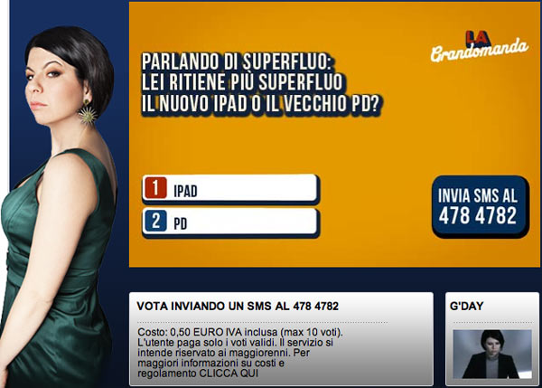 “Parlando di superfluo: lei ritiene più superfluo il nuovo iPad o il vecchio PD?” chiede la simpatica ed irriverente comica, che ogni sera intervista qualcuno mettendolo in un frigorifero.