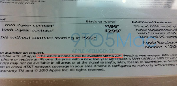 Aggiornamento del 05/12/2010: un lettore di 9 to 5 Mac ha notato che negli Apple Store l’indicazione dell’iPhone 4 bianco è scritta sul listino prezzi esposto, precisando che la versione del colore mai arrivata in commercio sarà disponibile dalla primavera 2011.