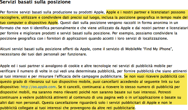 I dati restano anonimi, come recitano le nuove regole sulla privacy del nuovo sistema operativo mobile, ma vengono condivisi sempre e senza chiedere nulla di specifico oltre all’accettazione dei termini d’uso generali. Però c’è la possibilità di rifiutare questa condivisione di dati, basta accedere alla pagina Opt out con ogni iPhone/iPod touch posseduto e questo non trasmetterà ad Apple ed ai suoi partner la posizione dell’utente ed il resto.