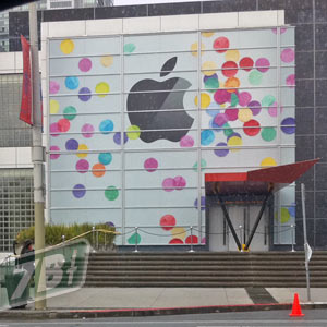 Fuori i pallini colorati (che sembrano coriandoli di Carnevale) sono il tema grafico scelto da Apple, ricoprono la facciata del centro espositivo ed al centro il logo di Apple.