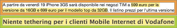 L'altro ha scambiato per l'ex "iPhone Pack", che adesso si chiama "Mobile Internet per iPhone", il secchio di vernice blu "Mobile Internet Data Pack". La deduzione che ne ha tratto è: il tethering dell'OS 3 non funziona con Vodafone. Verifiche e ragionamenti zero. Invece ad oggi il tethering è regolarmente attivo.