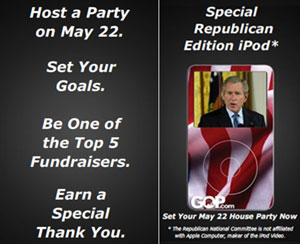Nemmeno il partito del presidente George W. Bush può fare a meno di fare leva sull'iPod per raccogliere fondi. Ai party repubblicani iPod Special Republican Edition in regalo.