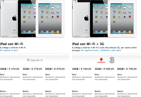Ricordatevi di puntare la sveglia all’orario giusto e speriamo che né le scorte né i server di Apple ci tradiscano. Immaginiamo che link diretto per gli ordini online dall’Italia sia questo: store.apple.com/it/browse/home/shop_ipad/family/ipad/select (mostra già un template incompleto ma senza la possibilità di piazzare ordini e stranamente si citano solo Vodafone e 3 come carrier per la versione 3G).