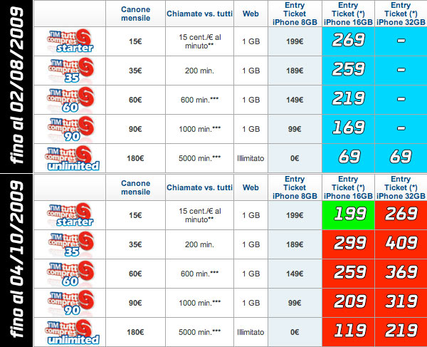 Ci sono quasi solo cattive notizie, tranne in un solo caso: l'iPhone 3GS da 16 GB prima costava un "entry ticket" da 269 euro per la tariffa Starter ed adesso invece 70 in meno, ovvero 199 euro (colore verde nella tabella). Tutto il resto sono aumenti che fioccano (colore rosso nella tabella).