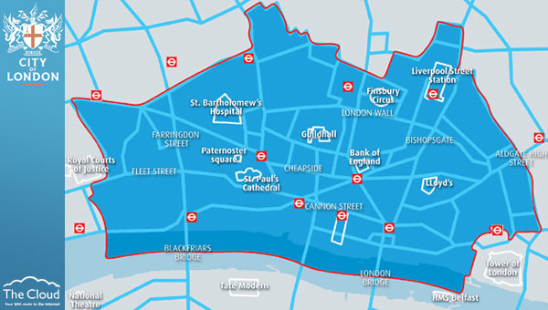 L'area mostrata nella mappa sottostante è quella contemplata da The Cloud e che copre la cosiddetta "Square Mile" di Londra.