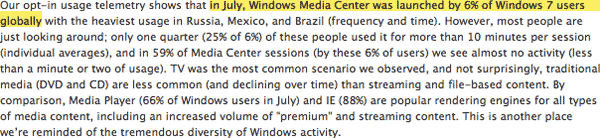 Solo il 6% degli utenti di Windows 7 usa il Media Center e, chi lo fa (cliccare un’applicazione per sbaglio è qualcosa che abbiamo provato tutti), ci resta solo 1 minuto o 2 al massimo. Teniamo anche conto che se qualche contenuto multimediale è disponibile in USA, non è detto che ci sia anche in altri mercati e che quindi sono poco stimolati.