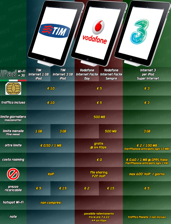 Il polpo Paul aveva ragione. La “triade” (non quella juventina) è ora ricomposta. Sia TIM che Vodafone che 3 offrono soluzioni per chi possiede un iPad dotato di modem wireless 3G, ma non è detto che a breve scenda in campo anche Wind, visto che è stata confermata la prossima disponibilità di micro SIM che non servono attualmente a nient’altro che ad iPad ed iPhone 4.