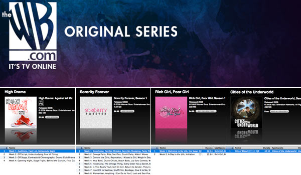 Con l'aggiunta del nuovo canale The WB (tornato in onda lo scorso aprile sulle frequenze USA), su iTunes Store arrivano tre nuove serie: "High drama", "Sorority forever" e "Rich girl, poor girl". Nella prima gli studenti della Barnstable High School mettono in scena il musical "The wizard of Oz", nella seconda è protagonista la vita di collage dell'associazione femminile Phi Chi Kappa, nella terza due ragazze di Los Angeles come Angie e Tarra si scambiano le vite per una settimana. Per tutti la prima puntata è in omaggio. Le successive costano 1 o 2 dollari l'una, anche se non si capisce quale sia il discrimine, visto che hanno tutte una durata molto breve di 13/25 minuti.