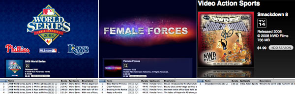 Si sono appena concluse le "World series – Fall classic 2008", ovvero le finali tra l'American League e la National League del baseball. Su iTunes sono disponibili le quattro partite da oltre 2 ore e 20 minuti che hanno visto sfidarsi i Tampa Bay Rays ed i Philadelphia Phillies. Ogni partita costa 2 dollari.