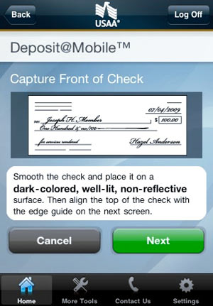 Con questo software gratuito è possibile fotografare un assegno ricevuto e la scansione sarà tradotta dalla banca in un versamento di denaro sul credito bancario. Lo smartphone diventa una specie di Bancomat a portata di mano. USAA ha calcolato che già il 12% dei versamenti avviene usando smartphone.