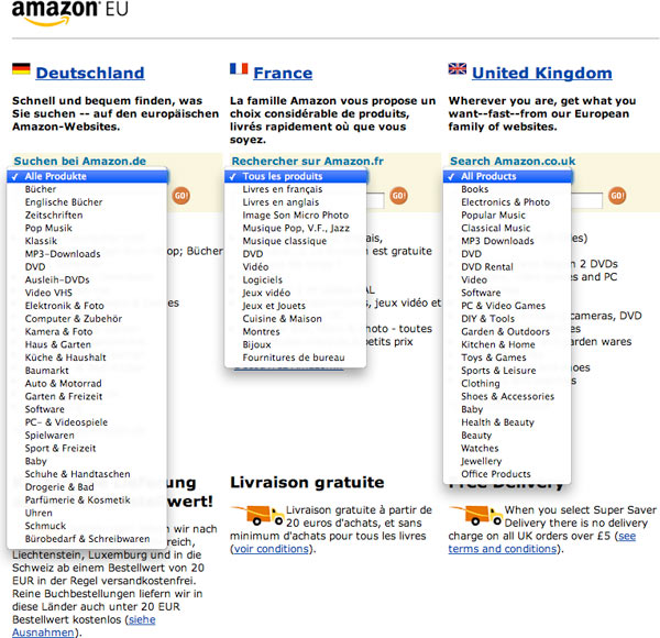 Come potete vedere dall'immagine sottostante i tre siti nazionali vendono prodotti diversi e bisogna certamente considerare che se acquistate un oggetto elettrico in Gran Bretagna vi arriverà con la mastodontica spina elettrica di quel paese o che scegliendo un laptop in Germania troverete una tastiera molto diversa (si trovano prezzi anche migliori di quelli dell'Apple Store). Non sembra ancora possibile acquistare musica da Amazon MP3 in Gran Bretagna o Germania, al pari dell'inammissibilità degli acquisti trans-nazionali su iTunes.