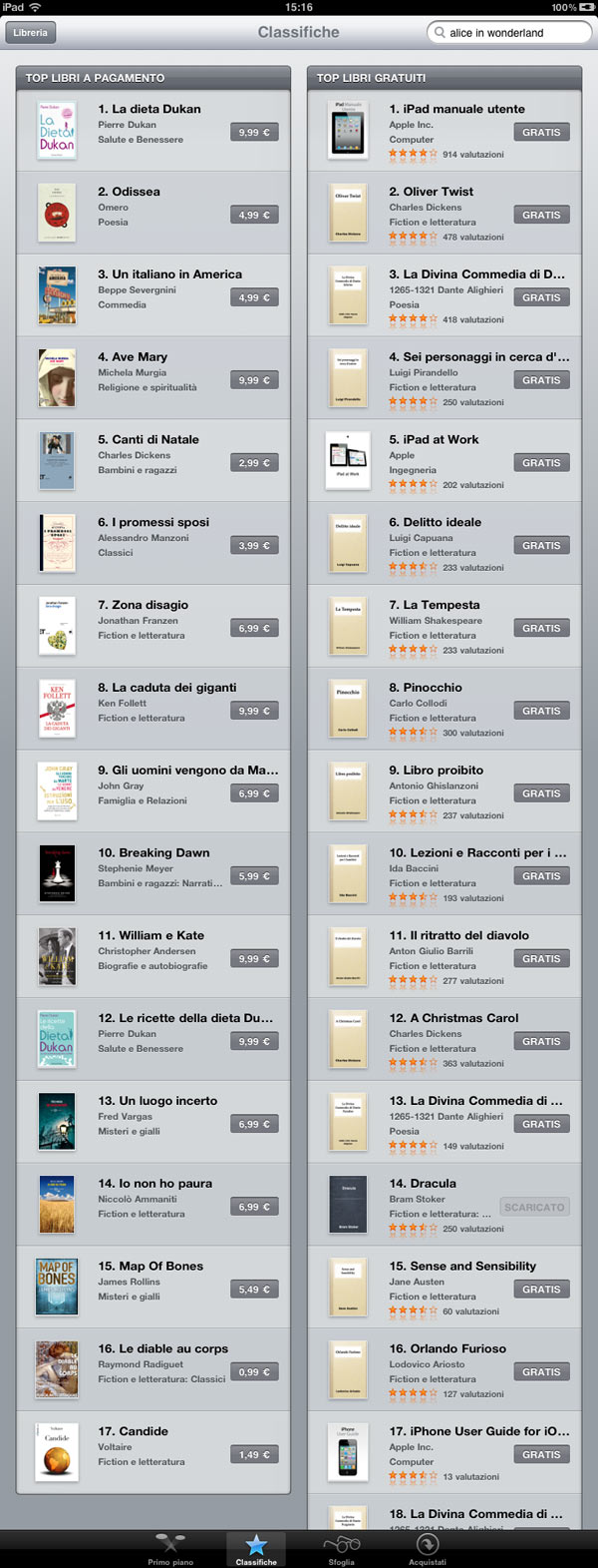 Tutto quello che si vede fin da oggi è una limitata classifica (finta, ovviamente, ancora nessuno ha comperato libri) di 17 titoli a pagamento, accanto a quella dei libri elettronici scaricabili gratuitamente, fondamentalmente derivati dal progetto Gutenberg (i soliti illetterati scriveranno “Gutemberg”, ne siamo certi) dei testi con diritti scaduti. Eccola di seguito.