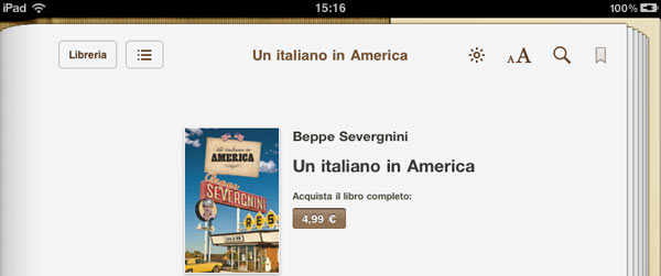 Tra i pochi titoli interessanti già disponibili, per esempio, notiamo “Un italiano in America” di Beppe Severgnini che è pubblicato da Rizzoli, questo non è recente come invece ci indica Apple. Qui, sul nascente iBookstore italiano, costa 5 euro.