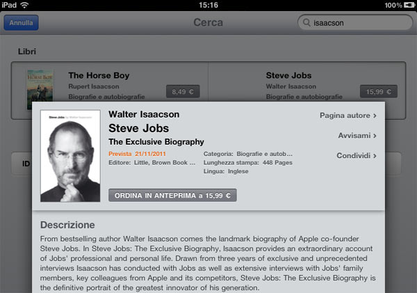 Ma oltre ai 17 libri della classifica, se si fanno ricerche saltano fuori altri testi. C’è anche la prossima biografia di Steve Jobs, ma qui presentata a chi desidera prenotarla in lingua inglese per 16 euro (per quella italiana, vedremo che vorrà fare Mondadori).
