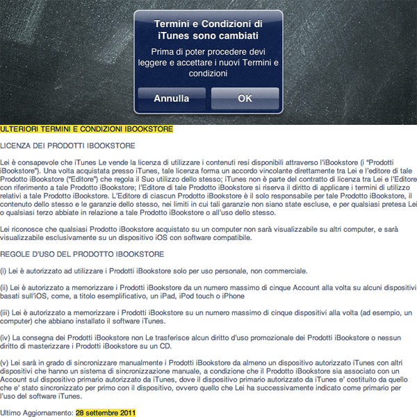 I nuovi termini d’uso aggiornati in data odierna comprendono già le regole per l’acquisto di libri elettronici da iBookstore Italia, eventualmente sincronizzabili.