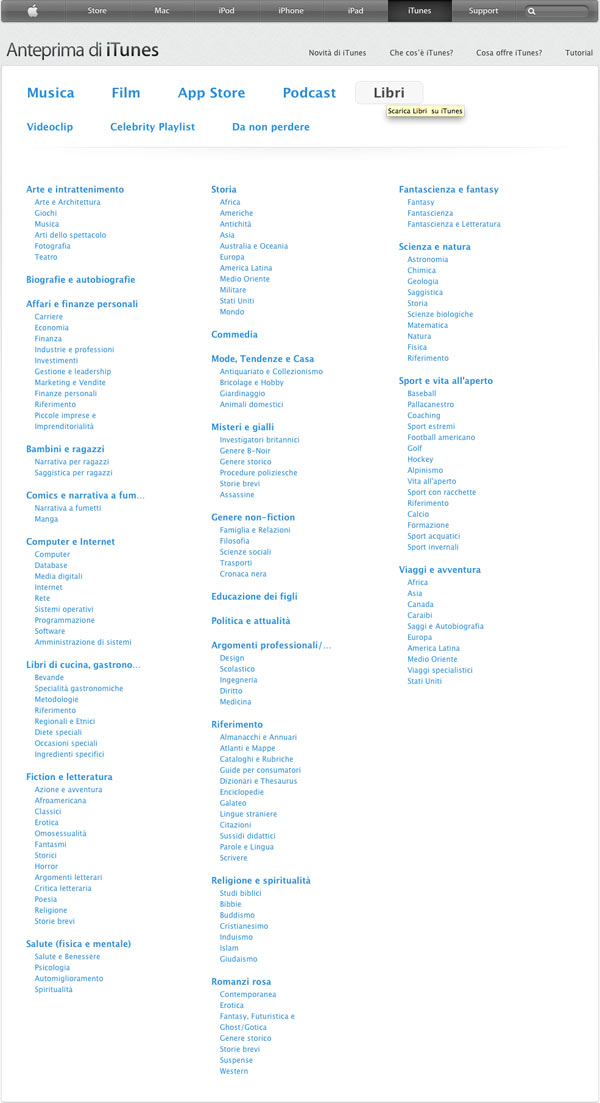 Aggiornamento del 28/09/2011: Mentre scopriamo che iTunes Connect si sarebbe aperto in un totale di 25 nuovi paesi per iBookstore (Austria, Belgio, Bulgaria, Cipro, Danimarca, Estonia, Finlandia, Grecia, Irlanda, Italia, Lettonia, Lituania, Lussemburgo, Malta, Norvegia, Olanda, Polonia, Portogallo, Repubblica Ceca, Romania, Slovacchia, Slovenia, Svezia, Svizzera ed Ungheria), iTunes non presenta ancora il menu dei libri per il nostro paese. Partendo però dalla visualizzazione nel browser di questo indirizzo, si può arrivare alla home page della sezione libri di iTunes Store/iBookstore ed alle sotto-sezioni, ma ancora nessun libro commerciale viene mostrato nel carosello iniziale. Una vera caccia al tesoro, auguri. Un lancio così, se lo avessero fatto in USA, qualcuno avrebbe istantaneamente perso il posto.