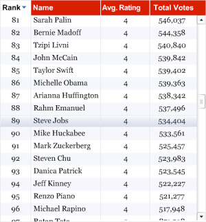 Il CEO di Apple era tra i finalisti per la quarta volta e, dalle votazioni partite in marzo, Steve Jobs ha raggiunto 534.404 voti con un giudizio di 4/100, che lo posiziona all’89esimo posto. Certo, meno di Barack Obama (37esimo) meno del Dalai Lama (61esimo) e di Benedetto XVI. Ma fa meglio dell’architetto ligure Renzo Piano (95esimo), della conduttrice televisiva Oprah Winfrey (98esima) e del sindaco di New York City Michael Bloomberg (100esimo).