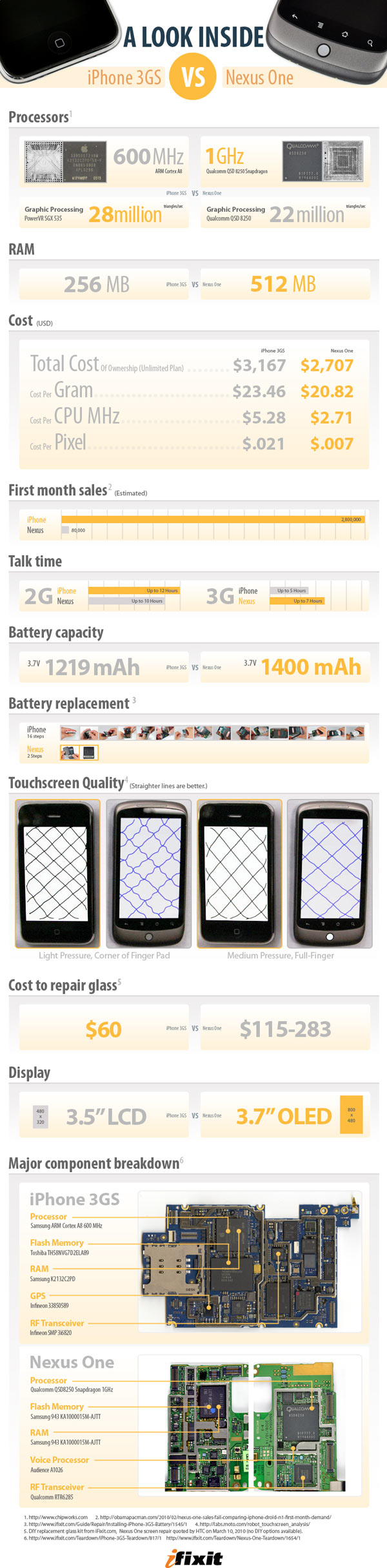 Il telefono di Apple usa un processore ARM @ 600 MHz e l’altro uno di Qualcomm @ 1 GHz, ma la potenza grafica dell’iPhone è superiore, nonostante una RAM che è la metà del Nexus One. Per sostituire la batteria del Nexus One basta aprire lo sportello posteriore ed estrarla, l’iPhone necessità di 16 passaggi (perché interna e non accessibile dall’utente).