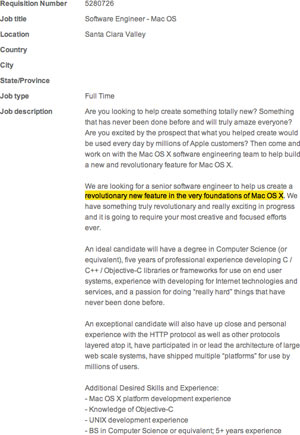 Grazie ad AppleInsider scopriamo che Apple cerca un software engineer stimolato a lavorare su una “rivoluzionaria nuova funzione alla base di Mac OS X, qualcosa di veramente rivoluzionario ancora in sviluppo”.