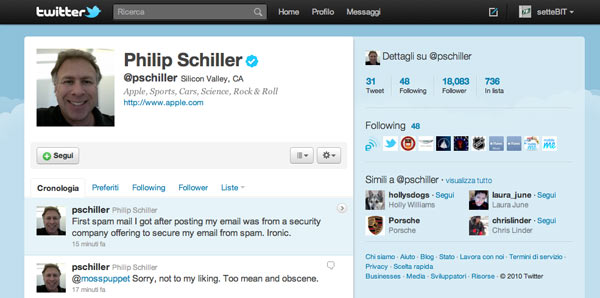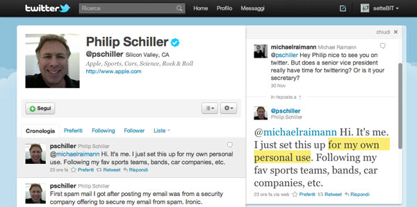 Aggiornamento dell’1/12/2010: Schiller fa sapere che i cinguettii sono scritti direttamente da lui, ma per “uso personale”. Non aspettiamoci quindi grandi informazioni come uomo del marketing di Apple.