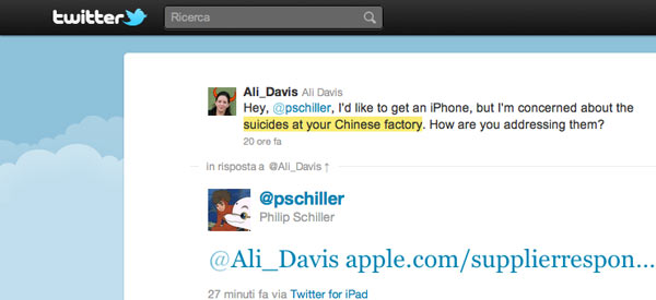 Ha scritto un messaggio al responsabile del marketing di Apple Phil Schiller, il quale aveva dichiarato di voler usare Twitter solo per amenità automobilistiche, sportive o musicali. Invece ci è ricascato ed ha risposto dal suo iPad. Non che sia stata una grande risposta, Schiller rimanda alla lettura dell’ultimo Supplier responsibility progress report, dove si possono leggere quante violazioni sono state riscontrate e (parzialmente) punite da Apple.