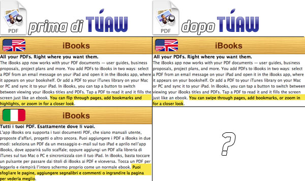 TUAW nel weekend ha avuto l’anonima soddisfazione di vedere corretto il testo presentato sul sito di Apple per gli Stati Uniti, nonostante l’assenza di differenze linguistiche con le pagine per la Gran Bretagna questa sezione non è stata aggiornata e continua a presentare la descrizione errata delle funzioni sui PDF. Inutile aggiungere che se non si sono curati dei cugini anglosassoni, la descrizione in italiano è ugualmente sbagliata.