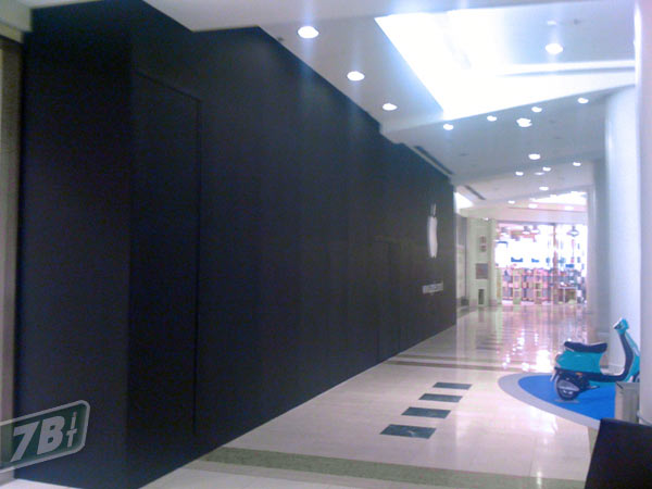 Nella foto che vedete accanto è tutto quello che si può intravedere dell’interno dell’Apple Store bergamasco, non è molto ma sembra che la retro-illuminazione dei pannelli sopra ai banchi d’esposizione sia già pronta.