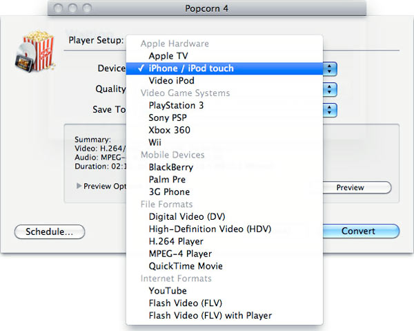 Sono pronti nel nuovo software una lunga lista di profili per i quali creare video nel formato giusto, tra questi iPod, iPhone, Apple TV, Palm Pre, RIM BlackBerry, Nintendo Wii, Microsoft Xbox 360 e Sony PS3/PSP go.