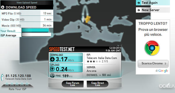 Invece nel download la velocità è diminuita. Se si dovessero verificare gli stessi risultati su tutta la tratta significherebbe un peggioramento della banda. Ma in compenso la stabilità è migliore di prima, quando cadeva spesso la linea.