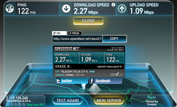 Aggiornamento dell’11/05/2011: un test non scientifico fatto sulla tratta del Frecciarossa, non distante da Firenze, indica un certo miglioramento della rete, rispetto alla fase iniziale dello scorso dicembre, ma solo nell’upload.