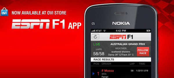 L’applicazione gratuita ESPNF1, dedicata alla Formula 1, è disponibile non solo su App Store ma anche su Ovi Store, il distributore di software per smartphone con Symbian.