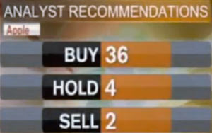 Per quel che valgono, le raccomandazioni degli analisti che seguono Apple propendono decisamente verso gli acquisti, secondo Bloomberg 36 consigliano di comperare, 4 di tenere e solo 2 di vendere.