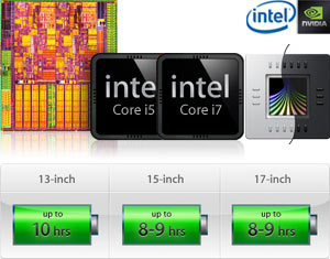 I Core 2 Duo di Intel restano a bordo solo del modello da 13 pollici, ma passano da un clock di 2,26 e 2,53 GHz a 2,4 e 2,66 GHz. I MacBook Pro da 15 e 17 pollici ora impiegano gli attesi Core i5 e Core i7 in versione laptop @ 32 nm, con clock da 2,4 a 2,66 GHz (fino a 50% più veloci) e supportano alla tecnologia Turbo Boost per toccare i 3,33 GHz con operazioni su singolo nucelo.