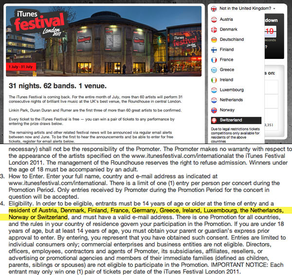Fino all’anno scorso hanno sempre potuto partecipare all’estrazione della coppia di biglietti omaggio solo i residenti in UK, quest’anno il sito elenca altri 11 paesi, peccato che qualcuno non rientri nella UE ed altri che ne fanno parte non sono stati considerati. Ci brucia che Italia non sia tra questi ma anche i cittadini di Belgio, Portogallo, Spagna (per citare solo i paesi con un iTunes Store nazionale) non potranno partecipare. Al contrario l’apertura ai cittadini di Danimarca e Grecia è benvenuta, inspiegabile (europeisticamente parlando) l’inclusione di Norvegia e Svizzera, che della UE non fanno parte.