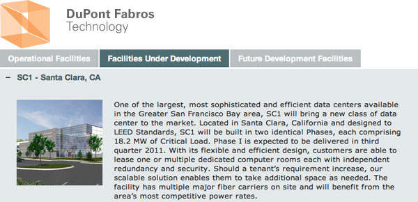 Oltre a gestire il piccolo ed anzianotto datacenter a Newark in California, il nuovo responsabile Kevin Timmons sarebbe al lavoro con DFT – DuPont Fabros Technology per affittare (forse per 7 anni) un datacenter di medie dimensioni da 11.000 piedi quadrati (1.022 metri quadrati) a Santa Clara, nel vicino comune della Silicon Valley e già sede di colossi come Intel. Dovrebbe essere completato nel terzo trimestre del 2011, con la prima fase dei lavori.