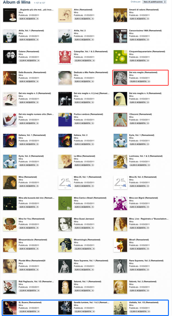 E’ disponibile anche lo speciale box digitale “Del mio meglio (remastered)” da 113 canzoni per 60 euro (riquadrato in rosso nell’immagine sottostante), tutti gli altri album appena aggiunti costano 10 euro, tranne 3 remastered da 13 euro (riquadrati in blu).