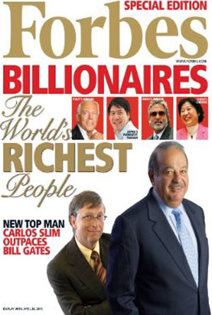Il nuovo più ricco è il 70enne messicano Carlos Slim Helú, proprietario di América Móvil e di un pezzo del New York Times, con 53,5 miliardi di dollari (+18,2 miliardi e +2 posizioni). Scavalca il fondatore di Microsoft Bill Gates (53 miliardi, +13 miliardi ma -1 posizione) e l’investitore di Berkshire Hathaway Warren Buffett (47 miliardi, +10 miliardi ma -1 posizione). Un podio che vale 153,5 miliardi di dollari, +41,5 sul 2009.