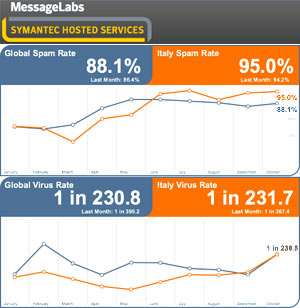 L'intollerabile percentuale globale di spam nel traffico email in ottobre è stata dell'88,1 (1 su 1,1), ovvero +0,18% su settembre. In Italia il livello è stato peggiore, del 95% (il mese precedente era del 94,2%).