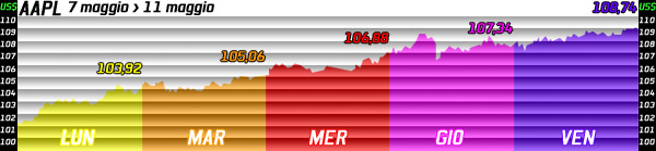 Lunedì mattina il titolo AAPL cominciava le contrattazioni a 101,08 dollari, questa sera, al termine degli scambi della settimana, il prezzo è stato fissato a 108,74 dollari, un aumento settimanale di circa l'8% e giornaliero dell'1,3%.