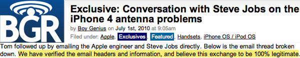 Ieri pomeriggio BGR pubblicava una serie di comunicazioni tra Steve Jobs ed un cliente di Apple insoddisfatto dell’iPhone 4, camuffato per l’occasione con il nome Tom. Il sito, passato poco più di 2 mesi fa al gruppo MMC, scriveva (ve lo riportiamo a fondo pagina) che di quegli scambi di messaggi erano stati controllati gli header e che sembravano al 100% veritieri.