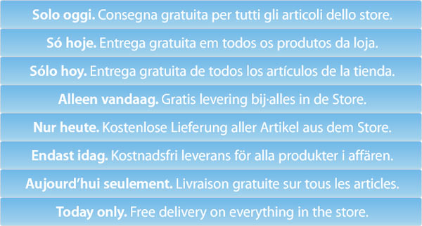 Solo per la giornata di oggi primo dicembre l'Apple Store Italia (come vediamo anche quelli di tutta Europa e pure in USA, Canada ma non ovunque) elimina i costi delle spedizioni. Molti prodotti non contemplano di norma il costo aggiuntivo dell'invio ma la maggior parte ha un limite di spesa sotto il quale va pagato a parte il corriere.