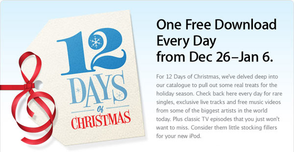 Nell'approssimarsi del Natale iTunes sta preparando una promozione denominata "12 days of Christmas", attiva solo in alcune nazioni. Al 99% in Italia non la vedremo. Apple promette un download gratuito tra brani musicali, videoclip e spettacoli TV, al giorno, tra il 26 dicembre ed il 6 gennaio. Registrandosi su iTunes UK (ed altri paesi ancora da definire) si può partecipare all'estrazione di 1.000 canzoni gratis. I vincitori saranno informati il 31 gennaio 2009, ma dovranno avere una residenza legale nel paese e non solo un account di iTunes.