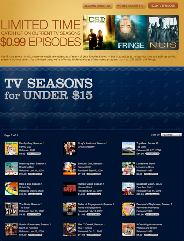 Sono anche disponibili intere stagioni ad un prezzo ridotto inferiore di 15 dollari, troviamo 15 titoli nel listino speciale, citiamo solo "Family guy", "Grey's anatomy" e "Top gear".