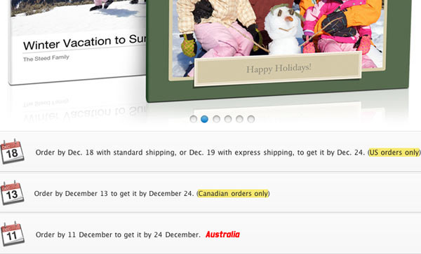 Sulle pagine destinate alla clientela USA si legge che entro il 18 dicembre (o 19 con corriere espresso) devono essere uploadate le fotografie digitali e richiesta la stampa che si preferisce, per poter ricevere i prodotti entro il 24 e festeggiare assieme la ricorrenza. Per il Canada il limite è il 13 dicembre e per l’Australia l’11 dicembre.
