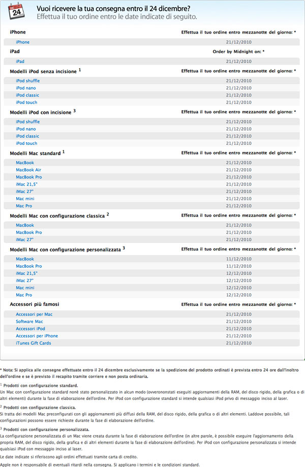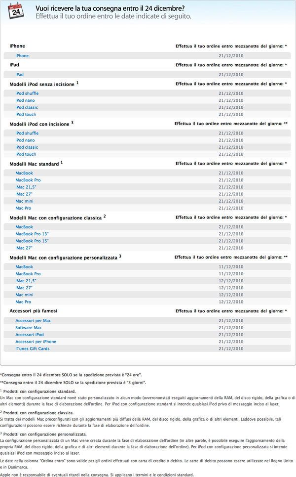 Certo, ce lo dicono in un misto italiano/inglese, ma la precisione non è di tutti ed il “graphics of Cupertin” si è distratto. Se infatti fossero stati accurati quelli che hanno fatto la correzioni ci avrebbero detto qualcosa anche di Apple TV, invece è ignoto il giorno massimo per ordinarla ed averla in tempo sotto all’albero di Natale.